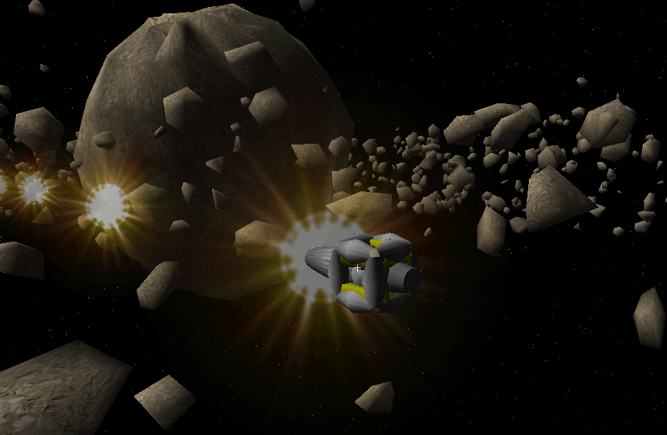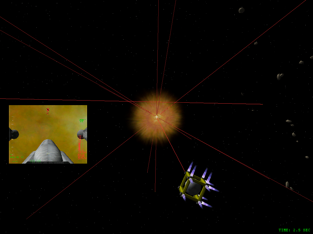The Advanced Combat Droid (ACD) is an evolutionary upgrade of the Robot Lazer Droid (or RLD, see above), designed for exploration and combat independent of a carrier ship. To that end, it boasts much more powerful batteryless nuclear water rockets, which have an unrefueled round-trip range of 245 km. It boasts a hex-phase encrypted spread-spectrum Ku band microdatalink, allowing remote control of the droid with streaming camera and sensor feeds. Its standard 22.3PHz processor automatically corrects for unnecessary drift motions, making it a perfect gun platform. (press S to disable / enable gunnery mode. It is suggested that you fly with this off when not lining up.)