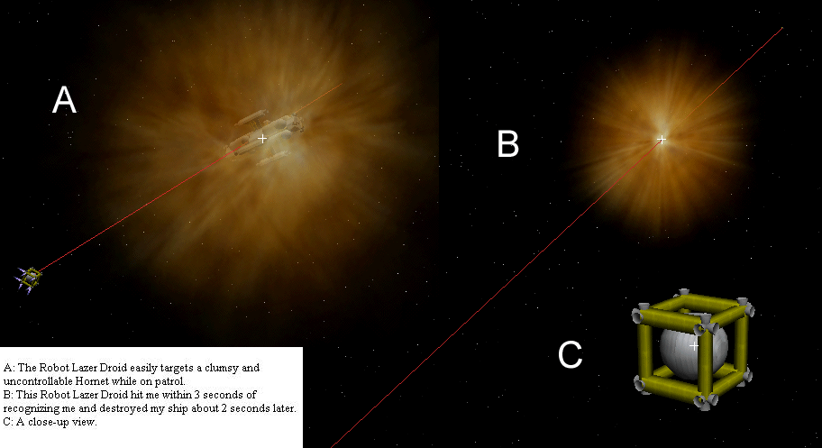 Clearly, Robot Lazer Droids outclass the usual fleet of Hornets or Wombatt-class defense fighters. Even one can target an enemy in under 3 seconds and not get so much as a failed thruster. Even if they are hit, no pilots are lost and it is easy to buy another. Even an Agamemnon can hold 12,500 of them, and it would take a very small investment. Just imagine! A fleet of tens of thousands of attackers, each targeting an enemy in 3 seconds! The Robot Lazer Droid is the only good choice for space warfare.